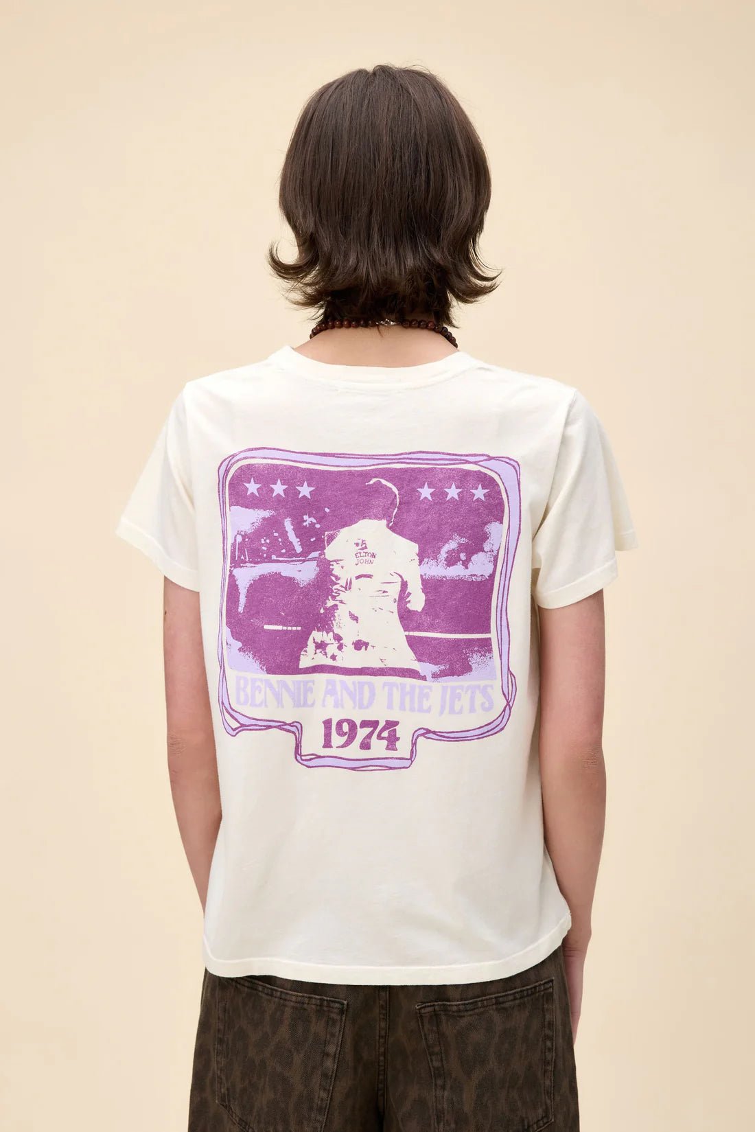 Make some noise for Elton John's massive hit and arguably most popular track "Bennie and the Jets." Represented on this Encore Tee with monochromatic art of the icon mid-performance and stamped with the song's release date.