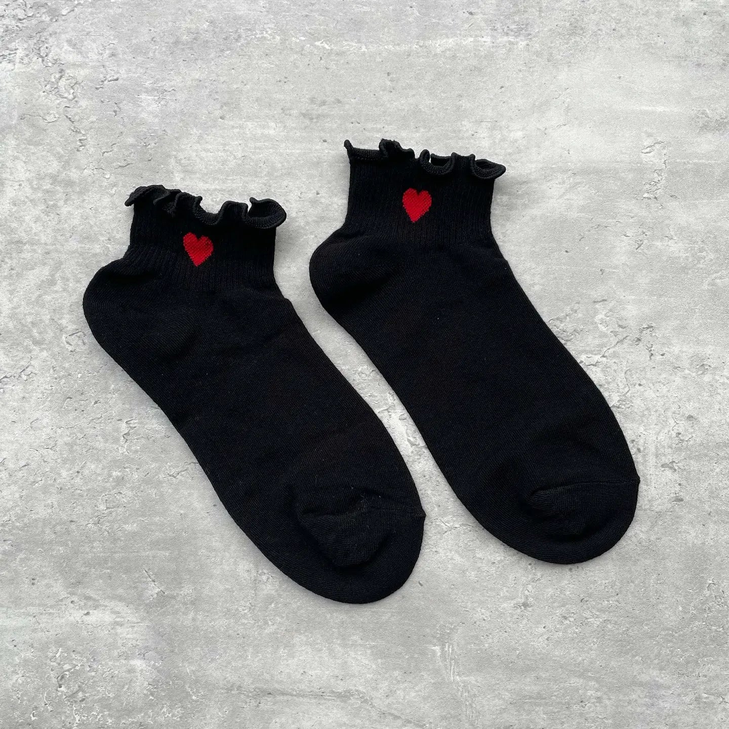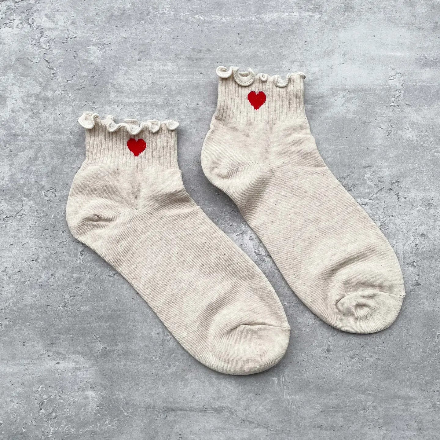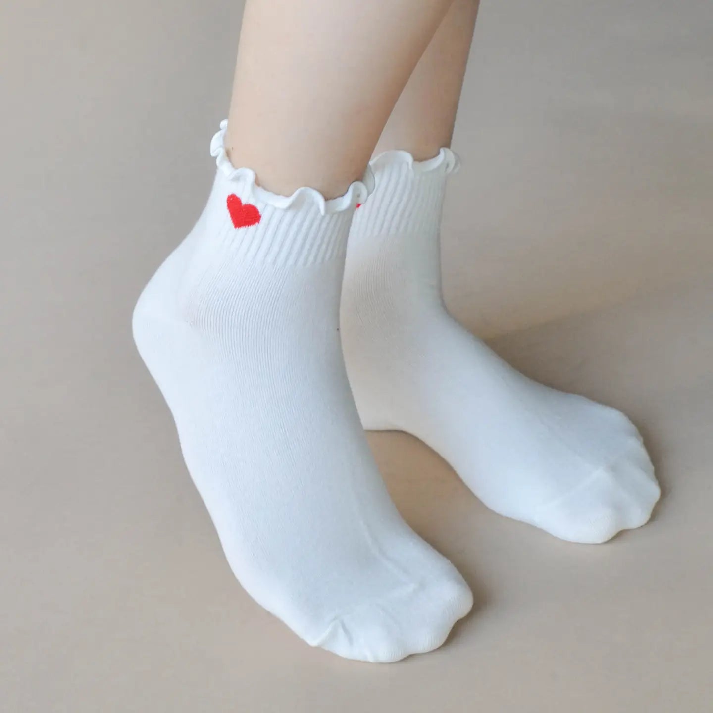 Ivory red Heart These songs are nice and basic, they even have a nice heart shaped on the top of the sock, it even has some lines and a nice curly simple design for the sock. These sock are also nice and soft and are really nice and comfortable to wear in a nice summer day or any season as you wish this sock even has two another hear on the other side of the sock with the other simple designs